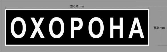 Шеврон виготовлений із чорної продубльованої тканини (має певну жорсткість) з вишивкою білого кольору "ОХОРОНА" і вишитою прямокутною рамкою теж білого кольору